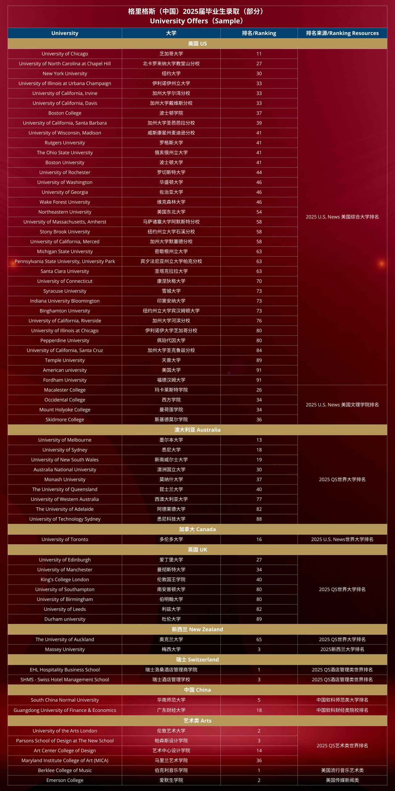 Griggs China Affiliated Schools—Shanghai Hongrun Boyuan School (SHBS), Guangzhou Zhongshan Whampoa School for Hong Kong and Macao Students (ZWIS), Kunshan Global International IELTS Centre Griggs Program (GIIC), and Kunshan Liren Foreign Language School—have achieved outstanding outcomes in the 2025 graduation season. With remarkable performance, our graduates have garnered impressive results on the global stage. This year, they have received admission letters from top universities across the world, including the United States, Australia, Canada, the United Kingdom, Switzerland, and New Zealand. These offers span a wide range of higher education fields such as comprehensive universities, liberal arts colleges, art institutes, and hospitality management schools, fully demonstrating the exceptional academic strength and global competitiveness of Griggs students.